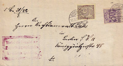 Inlandsbrief mit Zustellungsurkunde (1-20 g) vom 13.02.1922 frankiert mit 2 Marken (=5,50 Mark, 2 Brief 1,50 Zustellung 2 Urkunde)