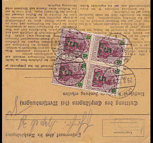 Inlandspaketkarte (13 500 g, > 75 km) vom 14.07.1922 frankiert mit 4 Marken a 10 Mark (=40 Mark) |