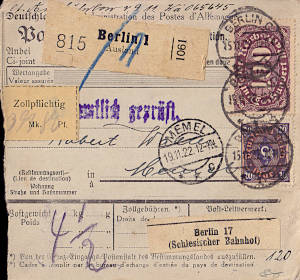 Auslandspaketkarte (2 400 g, > 75 km) vom 14.12.1922 frankiert mit 4 Marken a 30 Mark (=120 Mark)