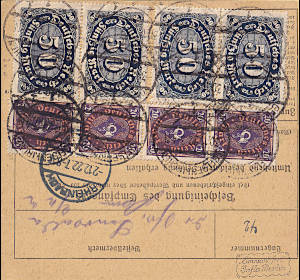 Inlandspaketkarte (9 700 g, > 75 km) vom 29.11.1922 frankiert mit 19 Marken (=240 Mark) |