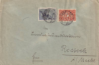 Inlandsbrief (1-20 g) vom 10.01.1923 frankiert mit 5 Marken a 5 Mark (=25 Mark)
