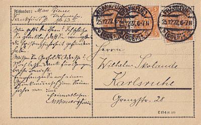 Inlandspostkarte vom 25.12.1922 frankiert mit 3 Marken a 5 Mark (=15 Mark) |