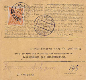 Inlandspaketkarte (4 000 g, < 75 km) vom 19.12.1922 frankiert mit 5 Marken (=125 Mark) |