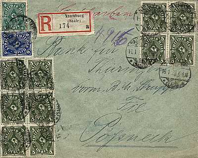Inlandsbrief mit Einschreiben (1-20 g) vom 16.01.1923 frankiert mit 12 Marken (=90 Mark, 50 Brief 40 Einschreiben) |
