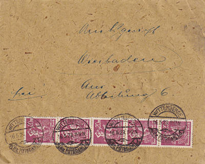 Inlandsbrief (1-20 g) vom 02.03.1923 frankiert mit 10 Marken a 10 Mark (=100 Mark) |