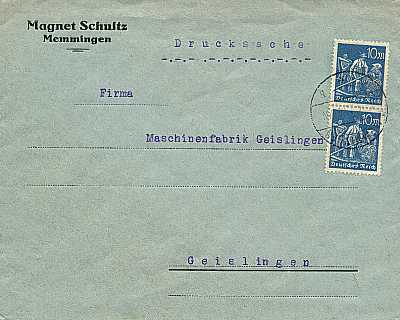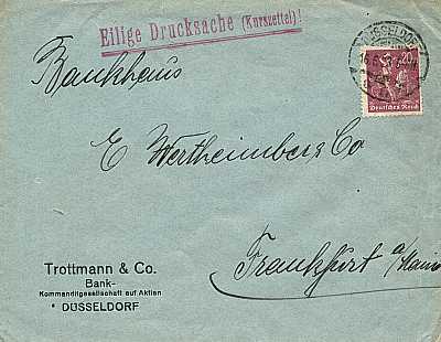Inlandsdrucksache (1-25 g) vom 24.03.1923 frankiert mit 2 Marken a 10 Mark (=20 Mark) |