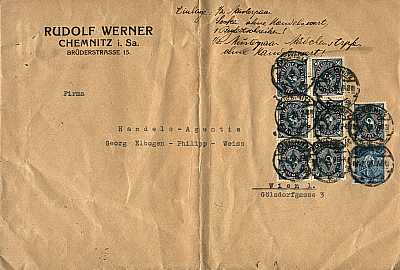 Auslandsbrief (1-20 g) vom 11.07.1923 frankiert mit 6 Marken a 50 Mark (=300 Mark)