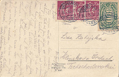 Auslandspostkarte vom 31.07.1923 frankiert mit 4 Marken (=360 Mark)