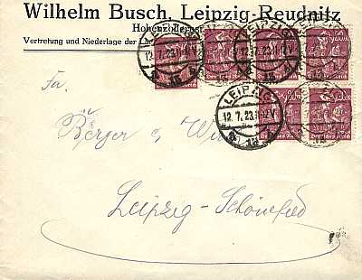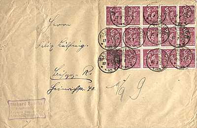 Ortsbrief (101-250 g) vom 17.07.1923 frankiert mit 15 Marken a 20 Mark (=300 Mark)