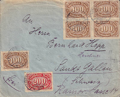 Foreign cover (1-20 g) from 11.08.1923 franked with 7 stamps (=3 000 Mark) |