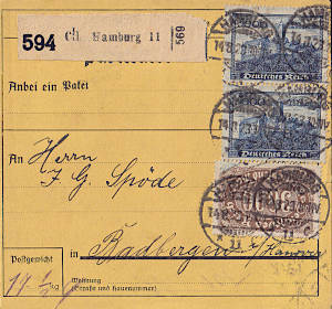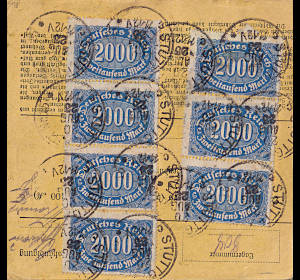 Inland parcel card (17 500 g, 75-375 km) from 14.08.1923 franked with 9 stamps (=27 600 Mark) |