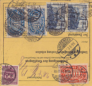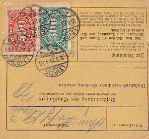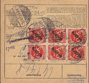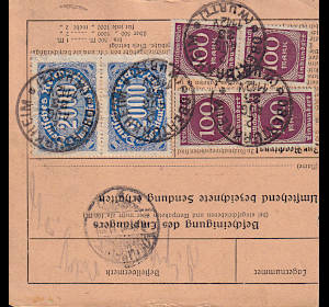 Inland parcel card (9 500 g, 75-375 km) from 20.08.1923 franked with 7 stamps (=13 200 Mark) |