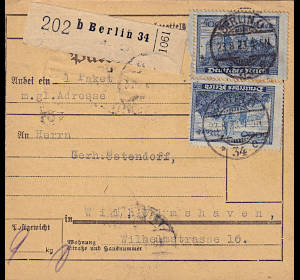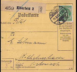 Inland parcel card (6 500 g, > 375 km) from 20.08.1923 franked with 8 stamps (=14 400 Mark) |