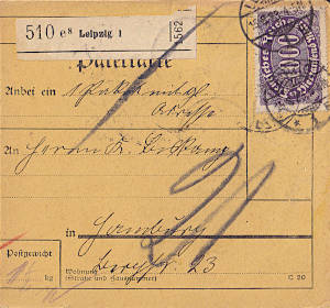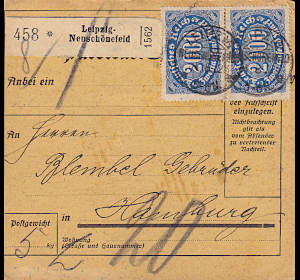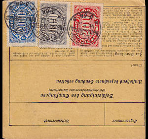 Inland parcel card (1 500 g, > 75 km) from 15.08.1923 franked with 3 stamps (=4 800 Mark) |