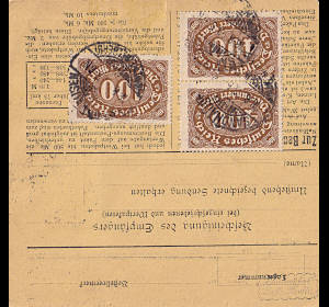 Inland parcel card (9 000 g, 75-375 km) from 23.08.1923 franked with 4 stamps (=12 000 Mark) |