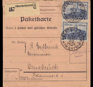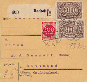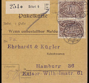 Inland parcel card (10 500 g, 75-375 km) from 04.08.1923 franked with 3 stamps a 5 000 Mark (=15 000 Mark) |