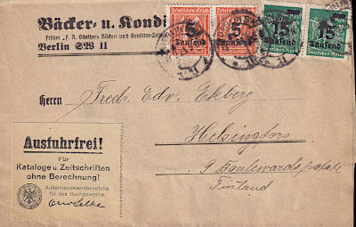 Foreign printed matter (1-50 g) from 18.09.1923 franked with 4 stamps (=40 000 Mark) |