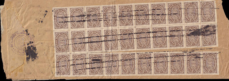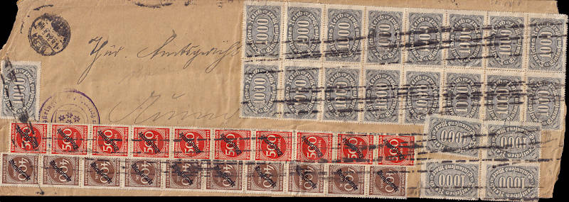 Inland cover (1-20 g) from 05.09.1923 franked with 25 stamps a 3 000 Mark (=75 000 Mark) |