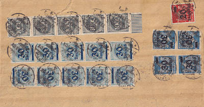 Auslandsdrucksache mit Einschreiben (501-1 000 g) vom 22.09.1923 frankiert mit 26 Marken (=625 000 Mark, 375 000 Drucksache 250 000 Einschreiben)