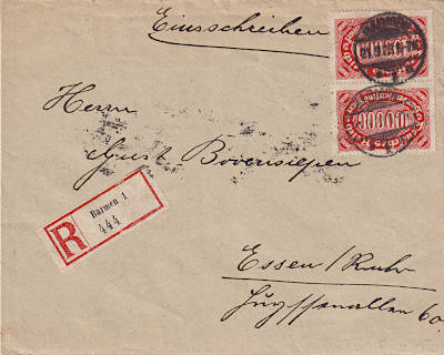 Inlandsbrief mit Einschreiben (21-100 g) vom 25.09.1923 frankiert mit 20 Marken a 30 000 Mark auf 200 Mark (=600 000 Mark, 350 000 Brief 250 000 Einschreiben) |