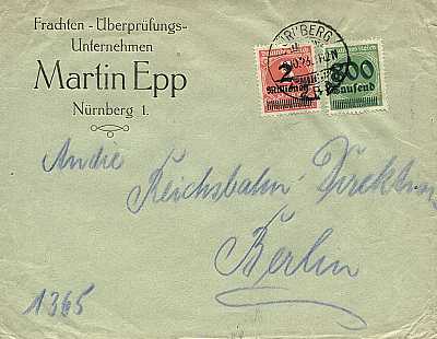 Inlandsbrief (1-20 g) vom 01.10.1923 frankiert mit 8 Marken a 250 000 Mark auf 500 Mark (=2 Millionen Mark) |