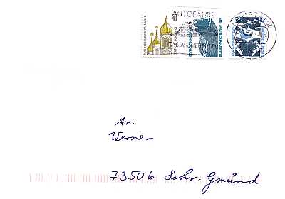 Brief frankiert mit ungültigen Briefmarken ohne Nachporto. Die Marken in DM-Nominale wurden als €-Marken verwendet |