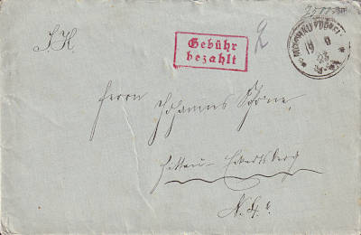 Mainz 3: Inlandsbrief (1-20 g) vom 22.07.1946 mit violettem Vierzeiler (4z) "Rpf./ Gebühr/ bezahlt/ - b -" und handschriftliche Gebührenhöhe "24" |