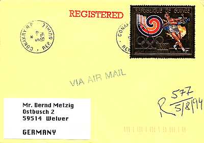 17.01.1987 Auslandsbriefe mit Einschreiben und Luftpost je frankiert mit einer Briefmarke Olympische Sommerspiele Seoul mit aufgeprägter goldener Metallfolie