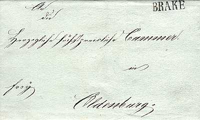 schwarzer Einzeiler "BRAKE" auf undatierter Hülle nach Oldenburg