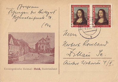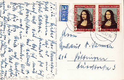 Auslandspostkarte frankiert mit 2 Marken Mona Lisa