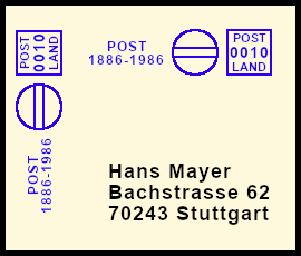 rückseitiger Freistempel: Postsendung bei der durch eine Fehlleistung der Freistempel auf der Rückseite anstatt auf der Vorderseite ausgeführt wurde |