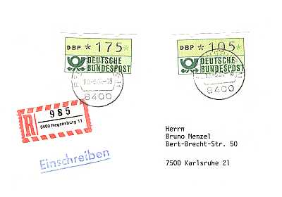 Automatenbriefmarkenwertstufenmisch-frankatur: Postsendung frankiert mit mehr-eren unterschiedlichen Automatenbriefmar-ken einer Ausgabe |