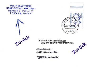Hinweisvermerk Einzelanschriftenprüf-ung: Vermerk der auf eine Sonderleistung hinweist bei der die Post die Adresse eines Empfängers auf Richtigkeit überprüft |