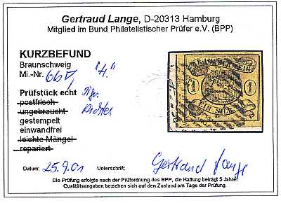 Brief Expert Finding: certificate issued by a stamp expert briefly listing the result of the examination |