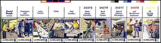 block of nine with 5 postage stamps and 4 printed labels with the sheet value price |